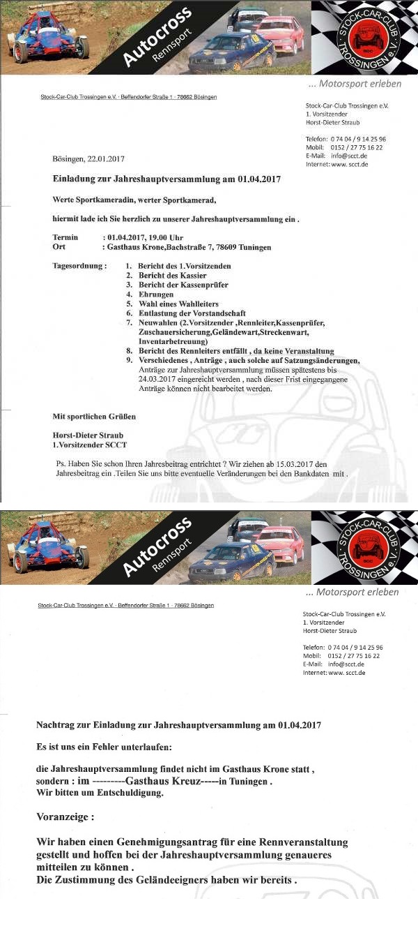 Jahreshauptversammlung des SCCT am 19.04.2024 , 19.30 Uhr in 78183 Hüfingen Behla ,Landgasthof Hotel Kranz"